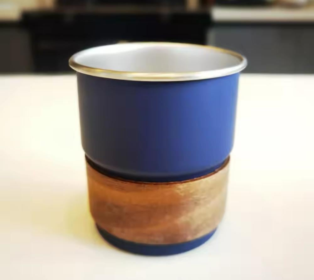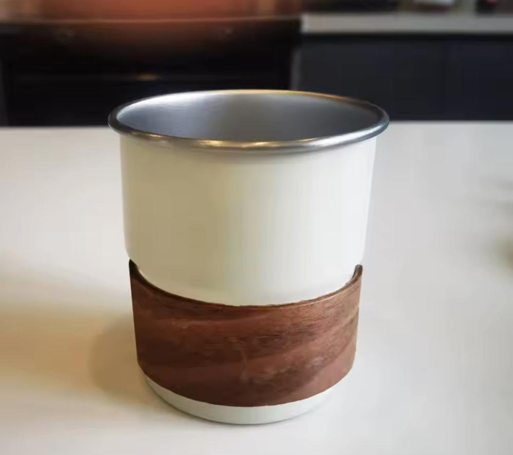 كوب من الفولاذ المقاوم للصدأ بحفر ليزر مُتقن بشكل شعار سيفين ونخلة, معه قطعة خشبية عازلة للحرارة قابلة للإزالة ، مناسب للمشروبات الساخنة والباردة.